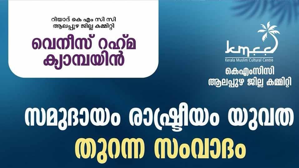 റിയാദ്: വെനീസ് റഹ്മ കാമ്പയിന്റെ ഭാഗമായി റിയാദ് കെഎംസിസി ആലപ്പുഴ ജില്ലാ കമ്മറ്റി സംവാദം സംഘടിപ്പിക്കുന്നു. നവംബര് 27 വ്യാഴം വൈകീട്ട് 8.30ന് ബത്ഹ അല് നൂര് ഓഡിറ്റോറിയത്തിലാണ് ‘സമുദായം രാഷ്ട്രീയം യുവത’ എന്ന വിഷയത്തിലാണ് തുറന്ന സംവാദം.