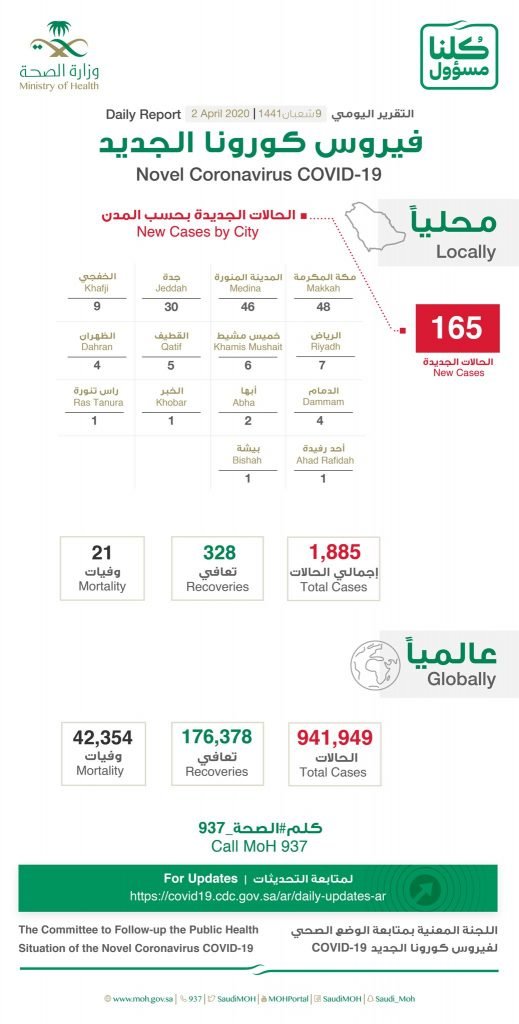 സൗദിയില്‍ ഇന്ന് 5 മരണം; പുതുതായി വൈറസ് സ്ഥിരീകരിച്ചത് 165 പേര്‍ക്ക്; രോഗബാധിതരുടെ എണ്ണം 1885