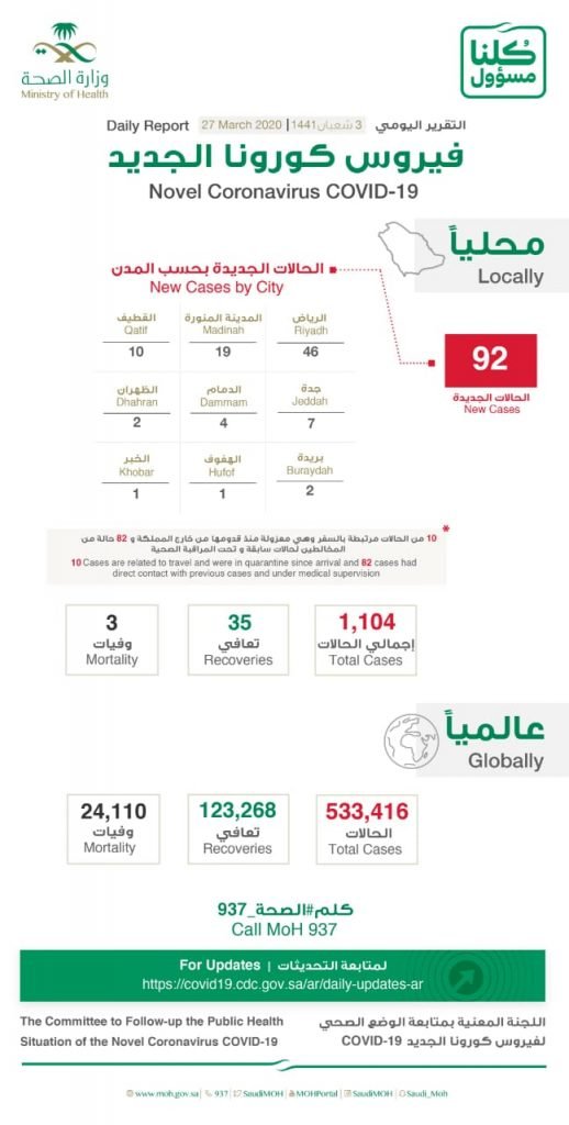 റിയാദ്: സൗദി അറേബ്യയില് ഇന്ന് 92 പേര്ക്കു കൂടികോവിഡ് ബാധ സ്ഥിരീകരിച്ചു. ഇതോടെ രോഗ ബാധിതരുടെ എണ്ണം 1104 ആയി. ഇതുവരെ 35 പേര്ക്കു രോഗം ഭേദമായി. മൂന്ന് പേര് മരിച്ചതായും ആരോഗ്യമന്ത്രാലയം അറിയിച്ചു. റിയാദ് (46), മദീന (19), ജിദ്ദ (7), ഖതീഫ് (10), ബുറൈദ (2), ദമ്മാം (4), ദഹ്റാൻ (2) ഹുഫൂഫ്, ഖോബാര് എന്നിവിടങ്ങളില് ഓരോ കേസുകളും റിപ്പോര്ട്ട് ചെയ്തു.