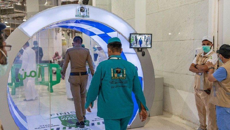 മസ്ജിദുല് ഹറമില് സ്ഥാപിച്ച സ്റ്റെറിലൈസേഷന് ഗേറ്റ് പ്രവര്ത്തന സജ്ജം. കവാടങ്ങളില് പ്രത്യേകം തയ്യാറാക്കിയ ഗാളാസ് കാബിന് വഴി അകത്തു കടക്കുമ്പോള് പൂര്ണമായും അണുവിമുക്തമാക്കി വിശ്വാസികളെ മസ്ജിദിലേക്കു കടത്തി വിടുന്നതിനാണ് ഇത് സ്ഥാപിച്ചിത്.